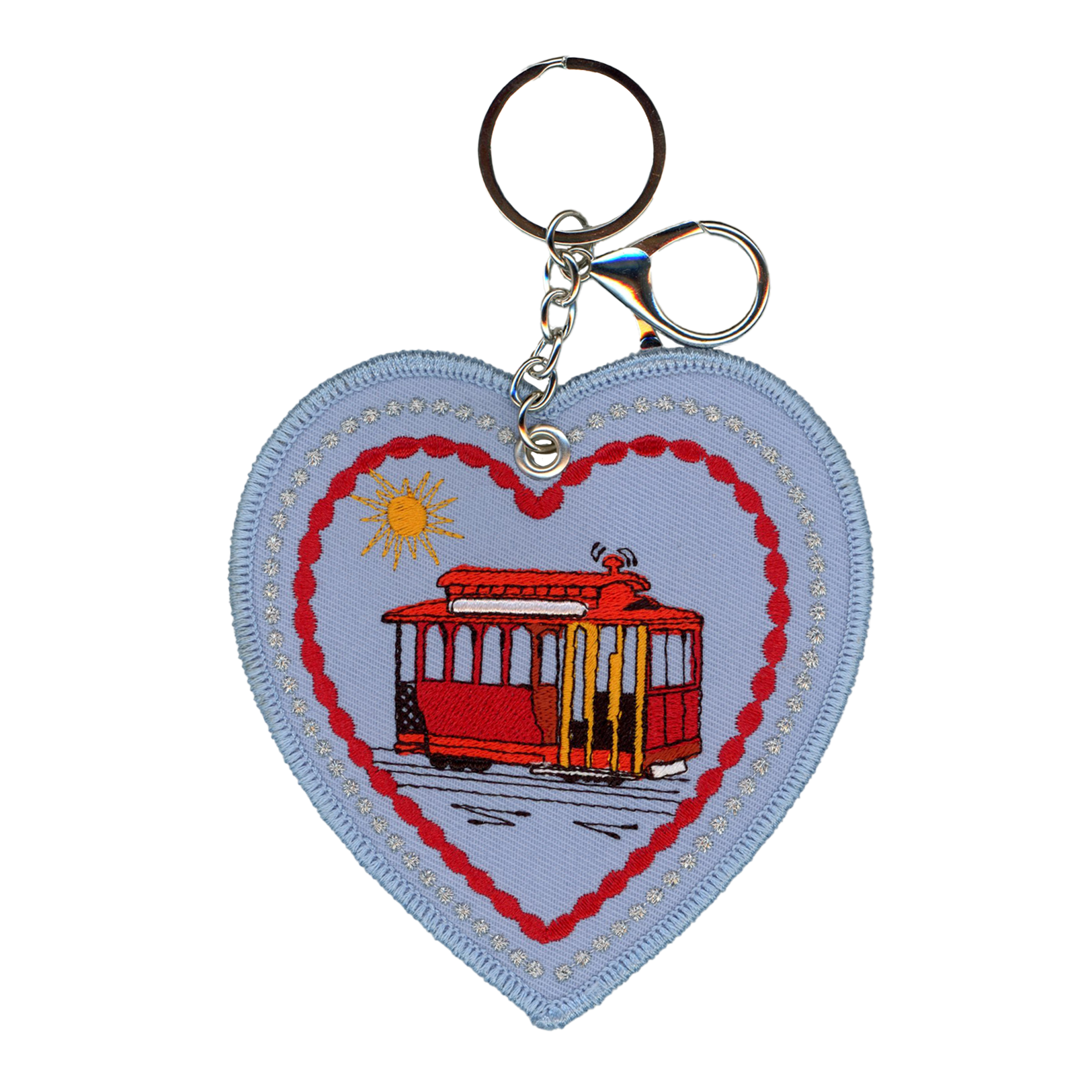 Las dos caras están bordadas, y lleva una anilla especial por si quieres usarlo de charm, o colocar la correa de tu perro.