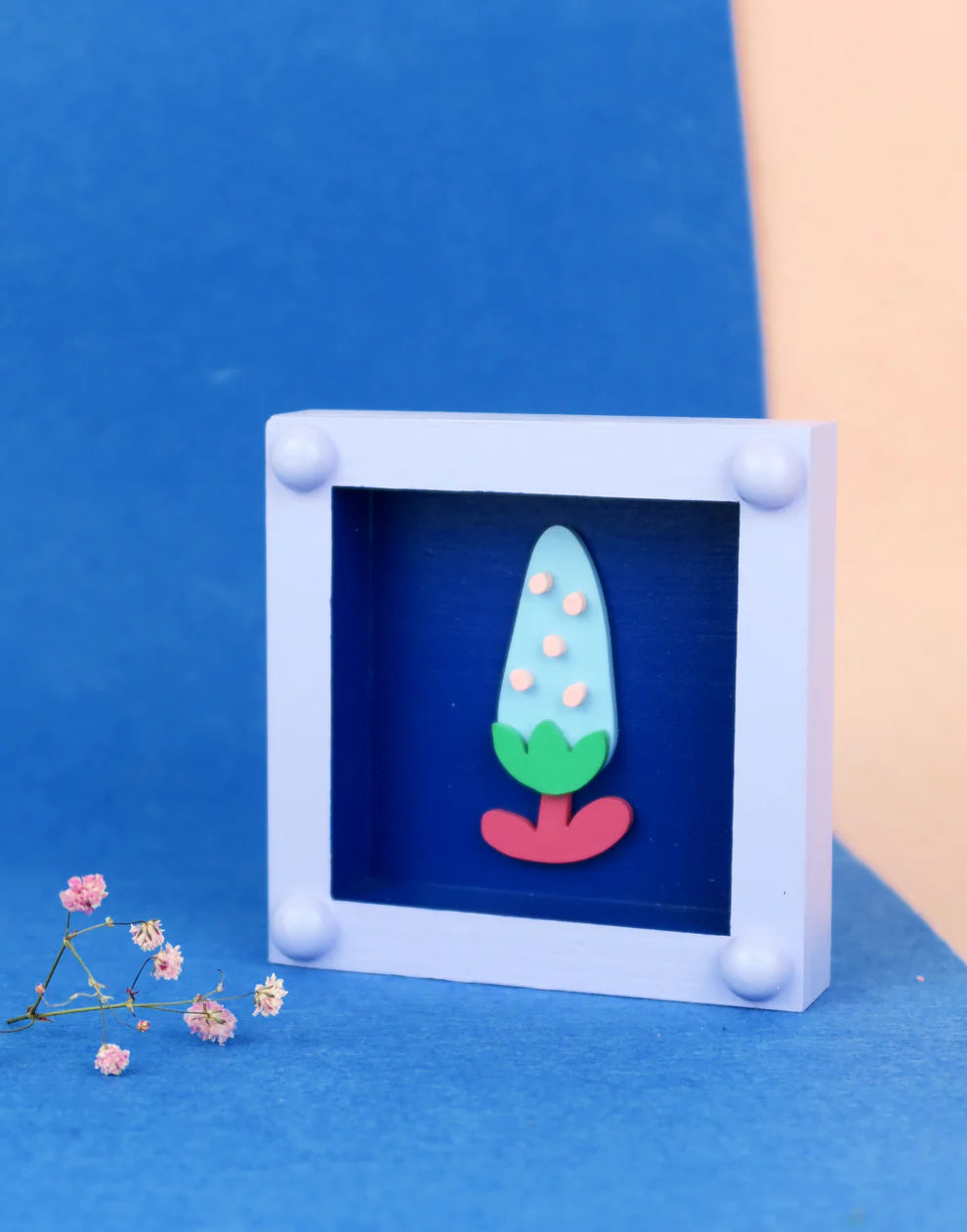 Pequeño cuadro decorativo artesanal hecho a mano, con flores de colores vibrantes sobre madera natural.
