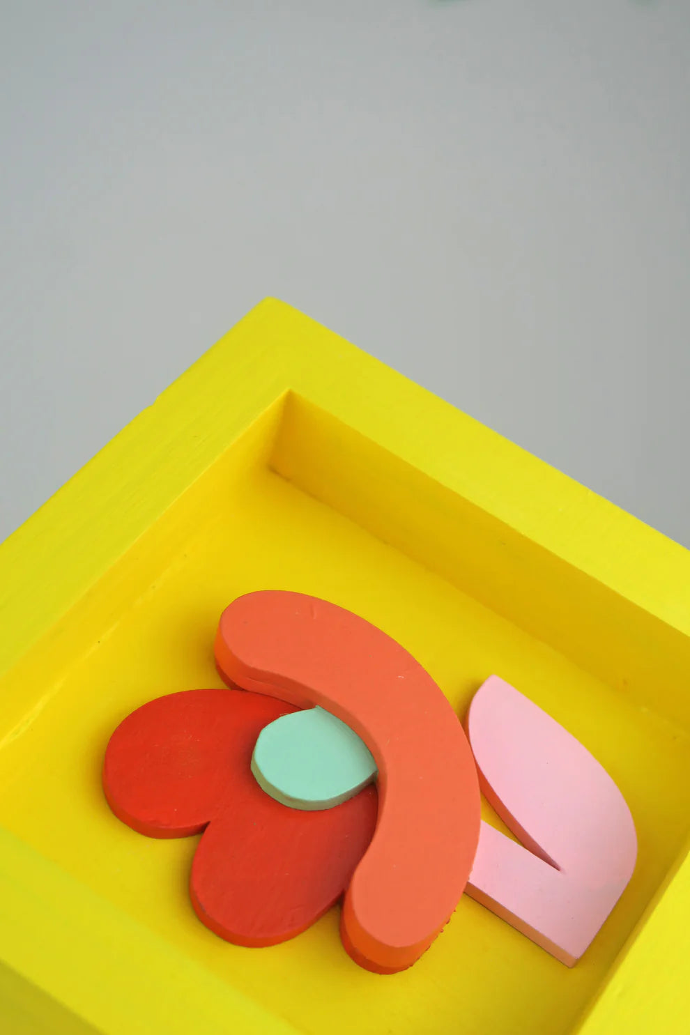 Pequeño cuadro decorativo artesanal hecho a mano, con flores de colores vibrantes sobre madera natural.