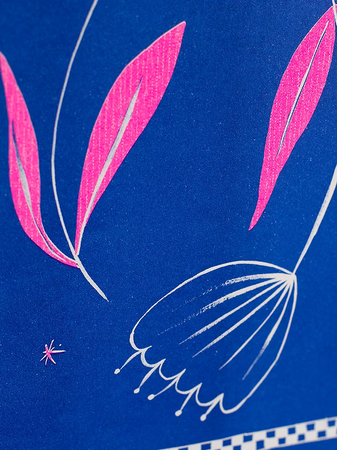 Tarjeta de felicitación tamaño A6, impresa en riso a tres tintas.